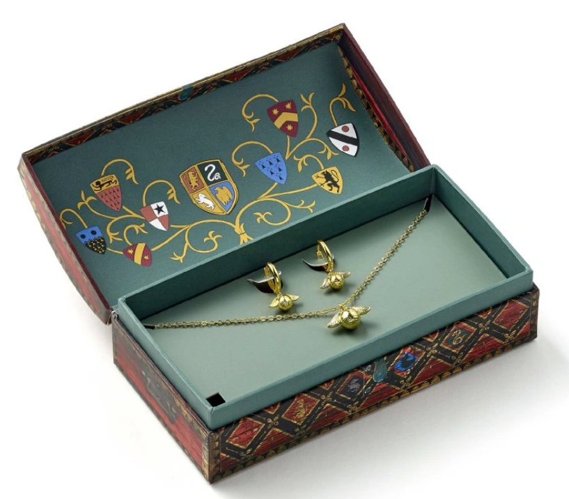 Dárková sada Zlatonka je jako dělaná pro všechny, kteří fandí famfrpálu – nebo prostě jen milují kouzelnický svět. Uvnitř elegantního boxu v designu famfrpálové truhly najdeš náhrdelník a náušnice se Zlatonkou, nejcennějším míčem famfrpálového zápasu. Díky propracovanému balení působí celá sada jako poklad z bradavického trezoru. Ať už ji daruješ, nebo si ji necháš pro sebe, rozhodně zazáří.