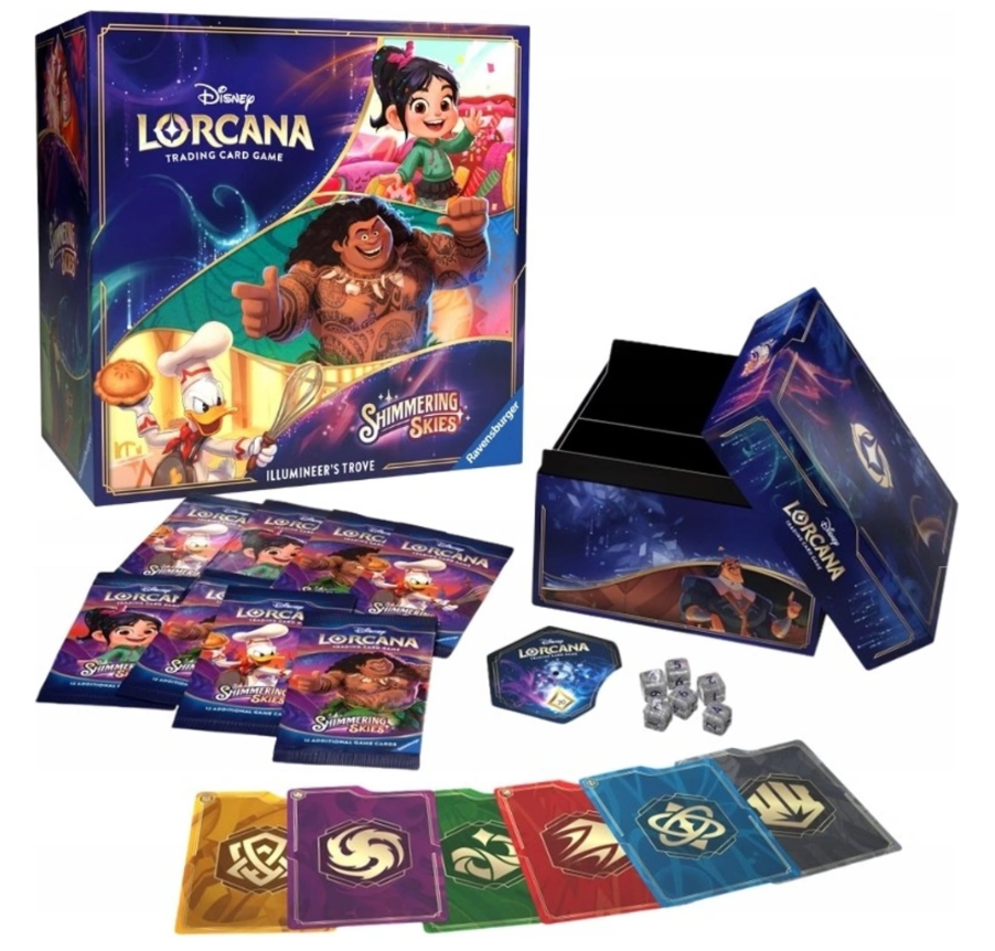 Obsahuje 8 booster balíčků z edice Shimmering Skies a praktické herní doplňky. Součástí jsou také organizér na karty, děličky, kostky a „Lore counter“.