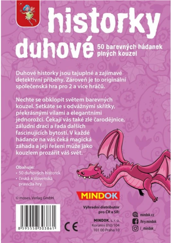 Duhové historky jsou kooperativní logické hádanky pro 2 a více hráčů, doporučený věk 8+, doba hraní přibližně 15 minut.