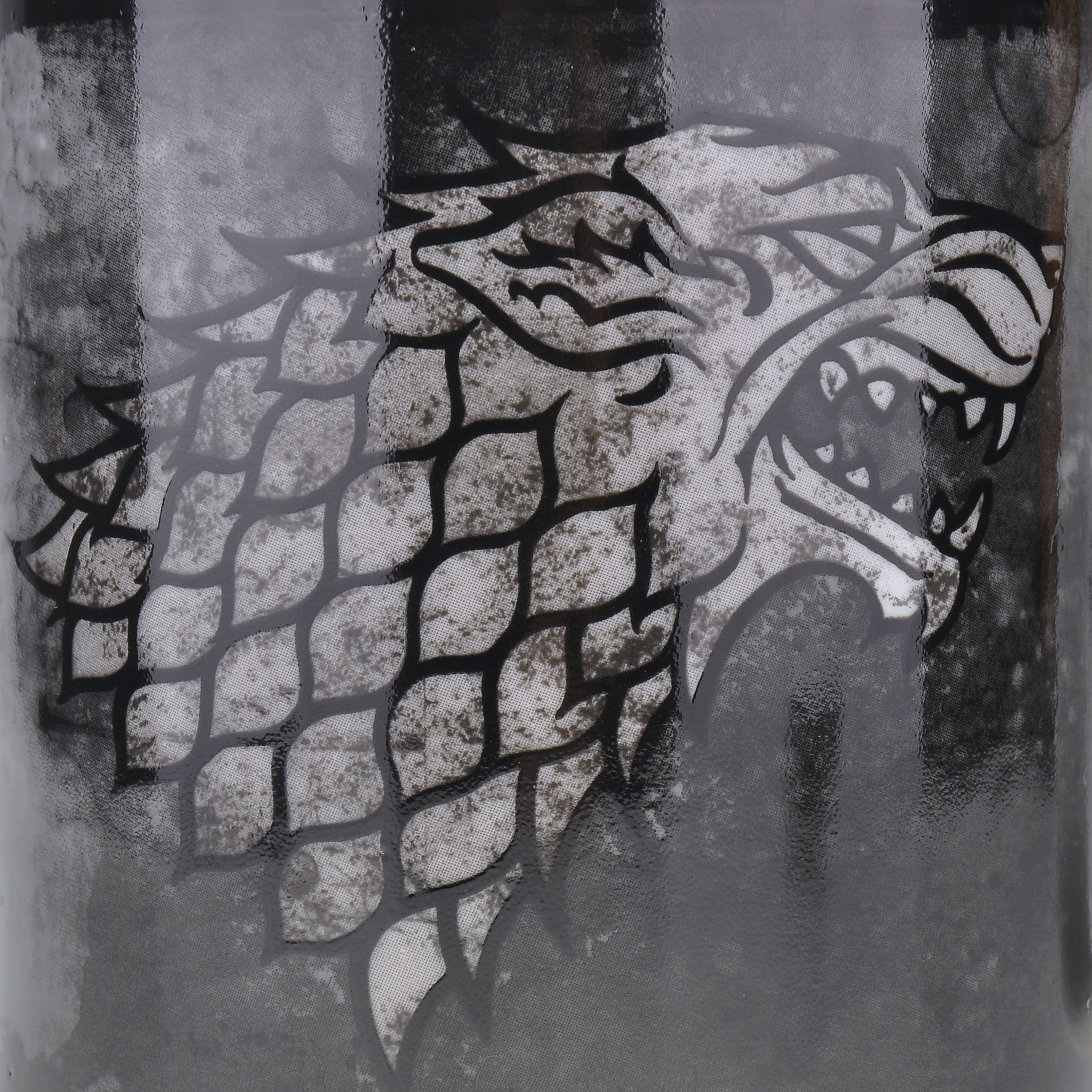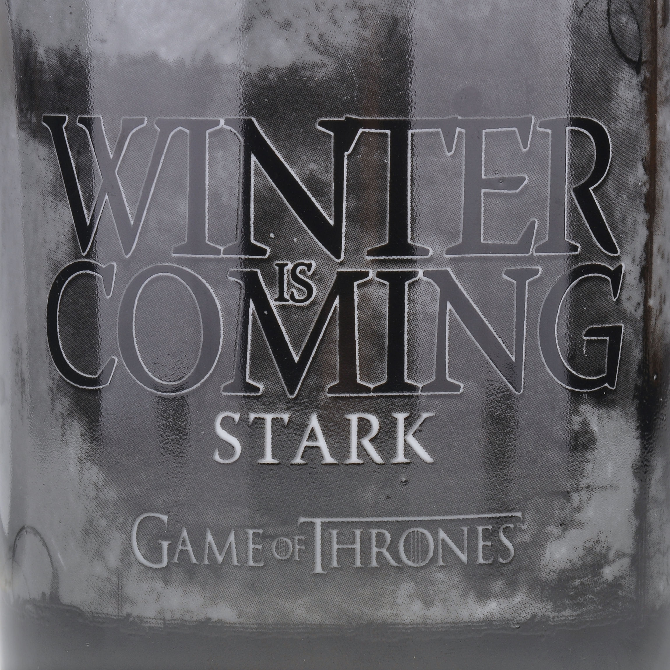 Hrníček s potiskem - znak Starků z filmového zpracování série Hra o trůny - Game of Thrones. Na druhé straně hrníčku je nápis Winter is comming .
