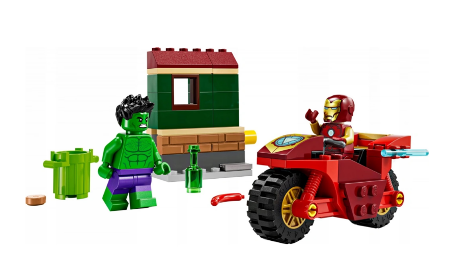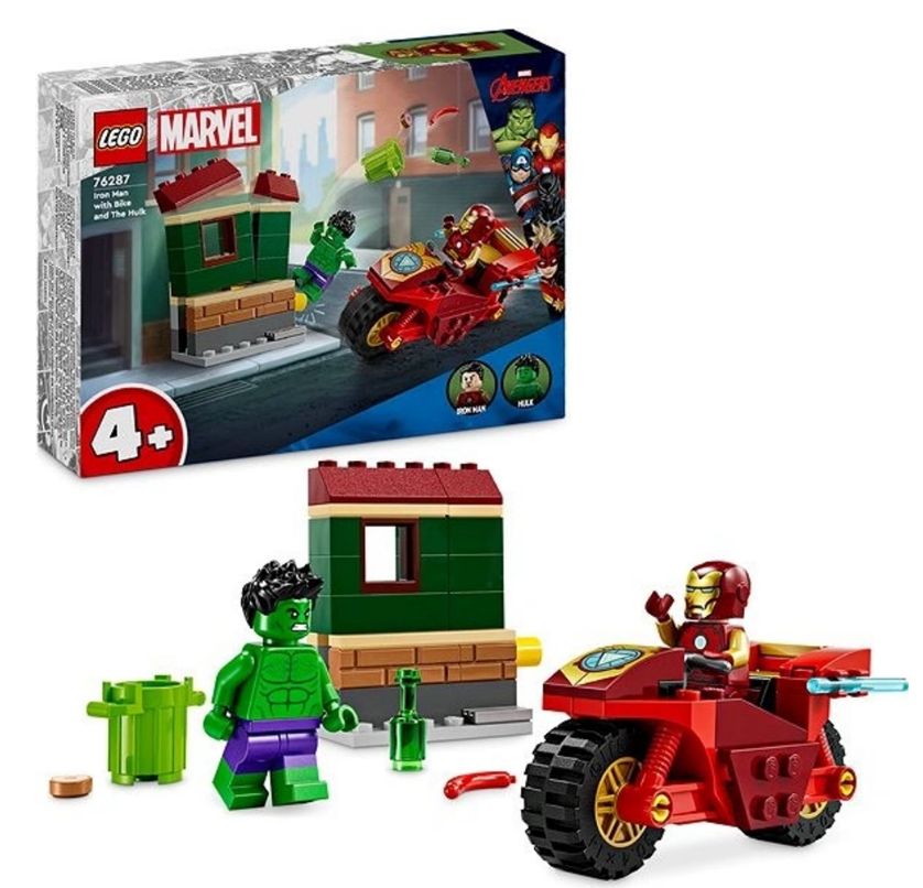 LEGO® Marvel 76287 Iron Man s motorkou a Hulk nabízí kreativní stavebnici pro děti od 4 let. Obsahuje minifigurky Iron Mana, Hulka, sestavitelnou motorku a zhroutitelnou budovu.