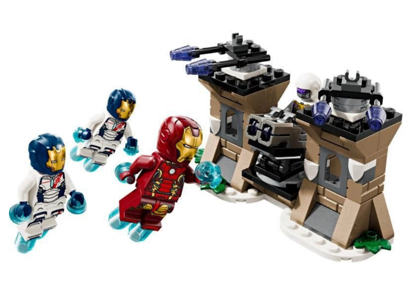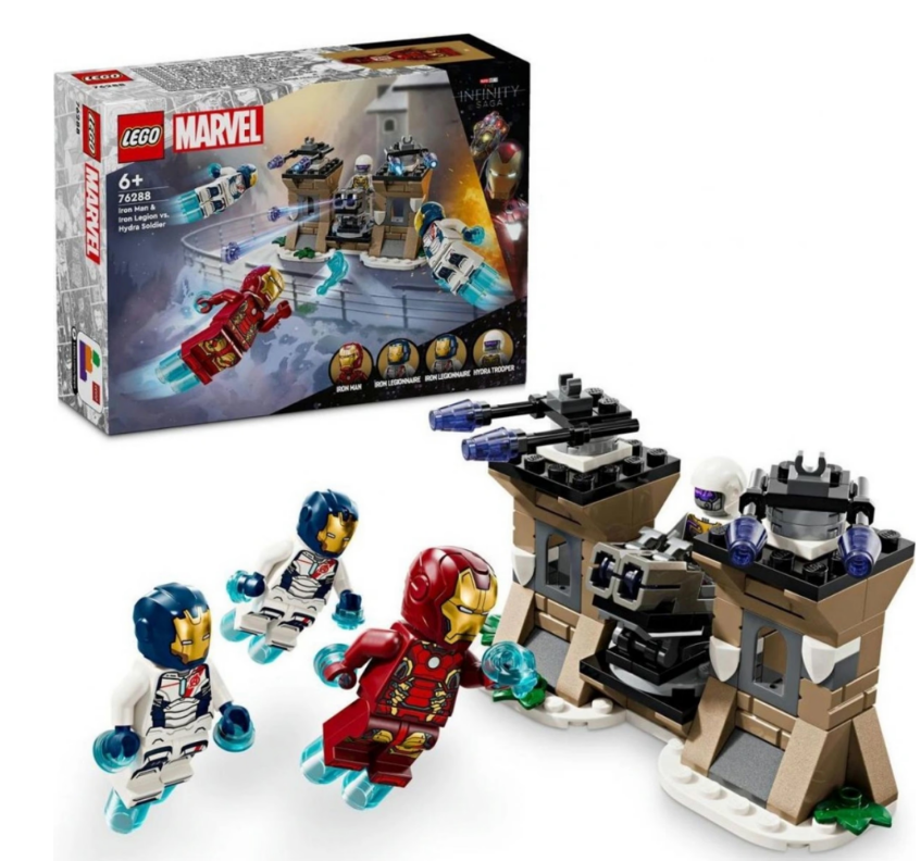 Set obsahuje minifigurky Iron Mana, vojáka Hydry a členy Železné legie, doplněné o autentické zbraně a pohyblivé prvky.
