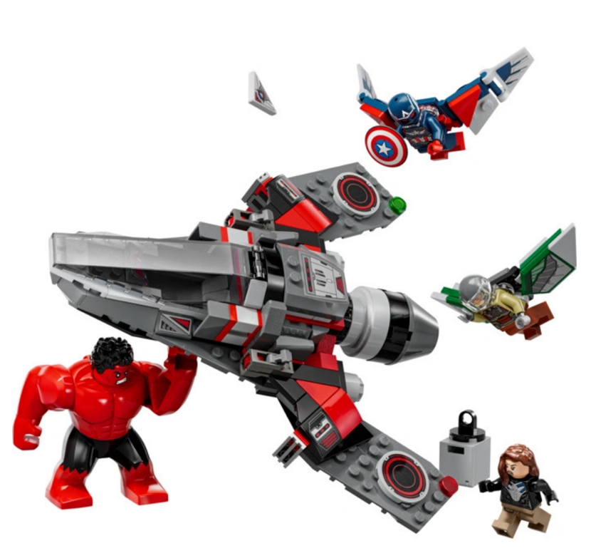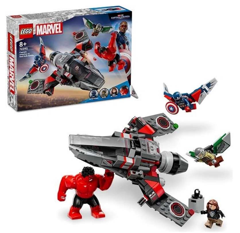 LEGO® Marvel 76292 – Souboj: Kapitán Amerika vs. Red Hulk. Set nabízí napínavou akci s minifigurkami Kapitána Ameriky, Falcona, Red Hulka a Ruth Bat-Seraph. Tento stavební set obsahuje letadlo s otevíracím kokpitem, dvěma vystřelovači a skrytým úložným prostorem pro tajné mise.