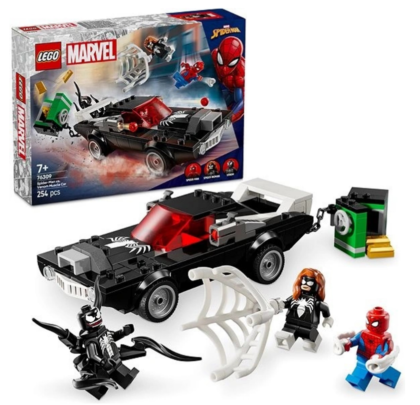 LEGO® Marvel 76309 Spider-Man vs. Venomův výkonný sporťák přináší interaktivní stavebnici od 7 let. Obsahuje 254 dílků, které umožňují postavit venomizovaný sporťák, trezor se zlatými cihlami. 3 minifigurky LEGO® Marvel: Spider-Man s vystřelovačem pavučin, Venom s 4 chapadly a Spider-Woman s velkou pružnou pavučinou.