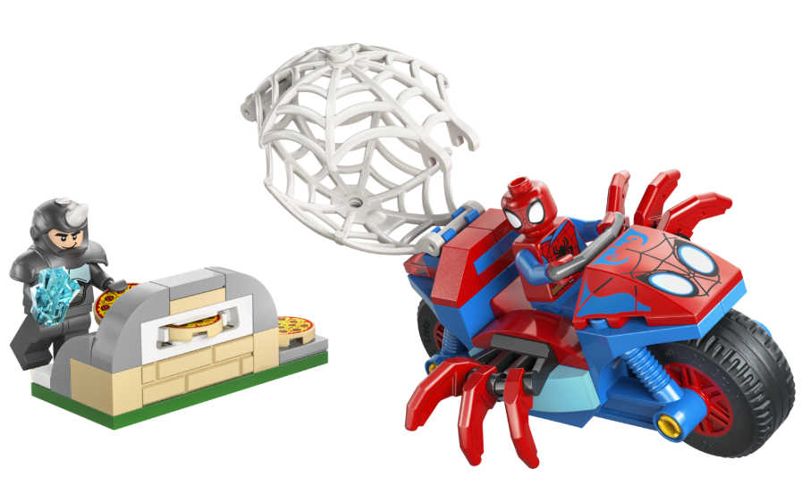 Set obsahuje minifigurky, motorku a Rhino model, které umožňují hraní ikonických soubojů.