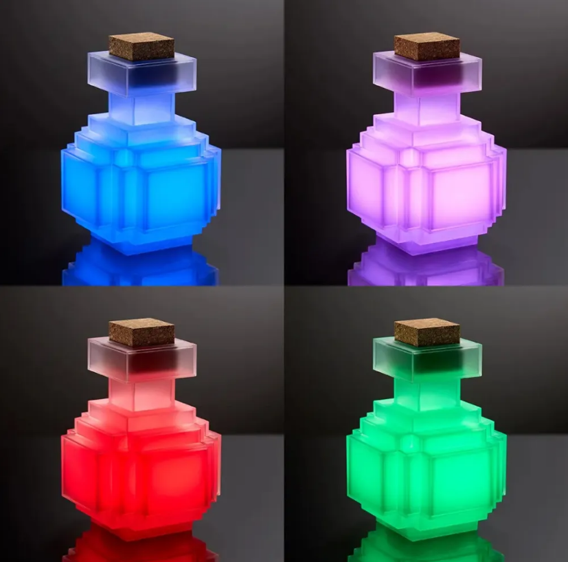 Stylové noční světlo ve tvaru lahvičky s lektvarem z ikonického světa Minecraftu.