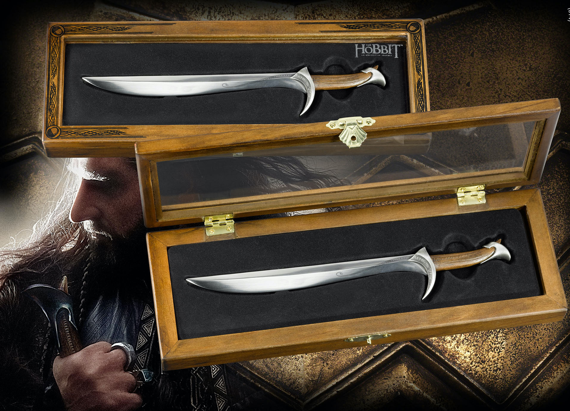 Zmenšená replika Thorinova meče (Orkrist) z filmového zpracování Tolkienova Hobita. Nůž je dlouhý 20,5 cm, součástí je dřevěná krabička o rozměrech 25 x 9 x 3 cm, velice věrná replika, která potěší všechny fanoušky Hobita.