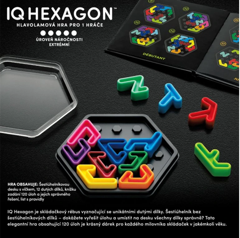 IQ Deluxe: Hexagon nabízí stylovou logickou hru v kompaktním kovovém provedení, která procvičí logické myšlení i prostorovou představivost. Hráč skládá barevné dílky do šestiúhelníkové herní plochy podle zadání a postupně řeší úlohy s rostoucí obtížností. Díky malé velikosti se hra hodí na cesty i každodenní hraní.